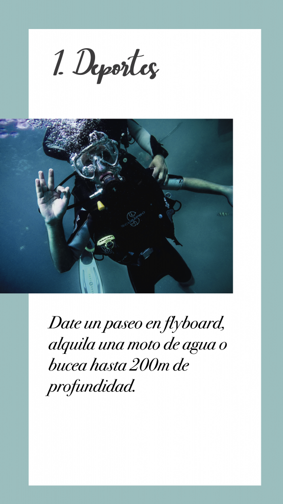 Si eres más aventurero te recomendamos practicar flyboard, alquilar una moto de agua o bucear hasta a 200 metros de profundidad.